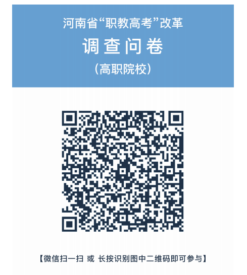 根据河南省教育厅办公室《球王会体育官方网开展“职教高考”改革问卷调查的通知》文件精神,为贯彻落实全国、全省职业教育大会精神,深入推进职业教育创新发展高地建设,加快建立符合技术技能人才选拔培养规律的“职教高考”制度,根据工作需要,现开展有关调查问卷工作,请招办、规划处及各个学院师生代表填写问卷(扫下图二维码),其中每个院部不少于5份。