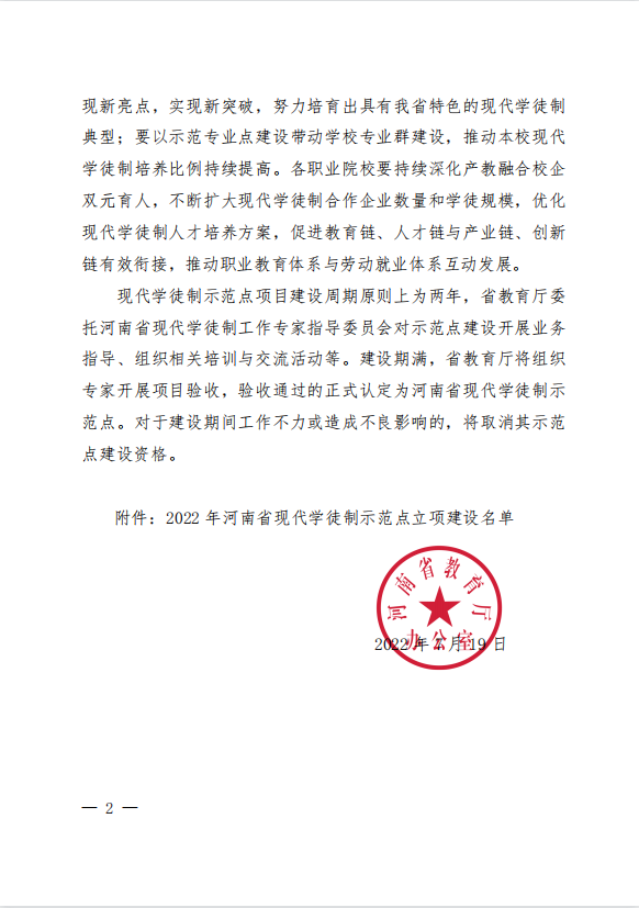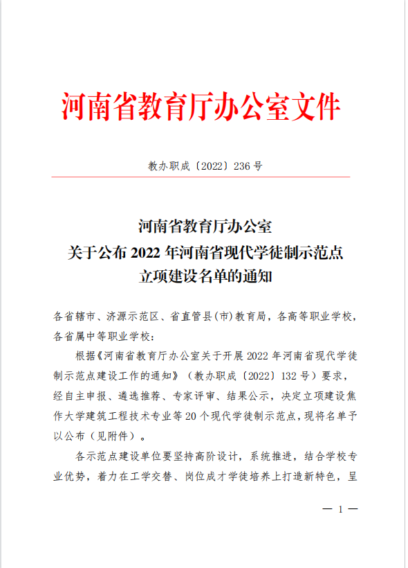 2022年河南省现代学徒制示范点立项建设名单的通知》(教办职成〔2022〕236号),球王会体育官方网土木建筑工程学院建筑工程技术专业被认定为河南省现代学徒制示范点立项建设项目。
