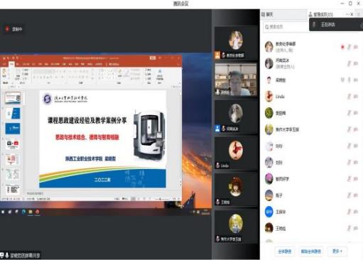 为帮助晋级省赛的参赛教师进一步打磨作品,同时,对学校课程思政建设工作做指导,教务处特邀请国家级课程思政教学名师梁晓哲(简介:陕西工业职业技术学院副教授;国家级课程思政教学名师;国家级职业教育教师教学创新团队骨干;教育部课程思政集体备课项目授课专家;陕西高校思政课教师“大练兵”课程育人“教学骨干”)进行线上指导培训,并对参赛团队进行专题辅导。