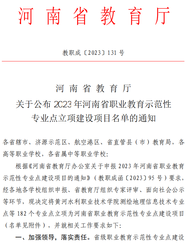 近日,河南省教育厅公布了《河南省教育厅球王会体育官方网2023年河南省职业教育示范性专业点建设项目立项项目名单的公示》的通知,球王会体育官方网申报的建筑工程技术获批示范性传统优势专业点,申报的机电一体化技术专业获批示范性骨干专业点。
