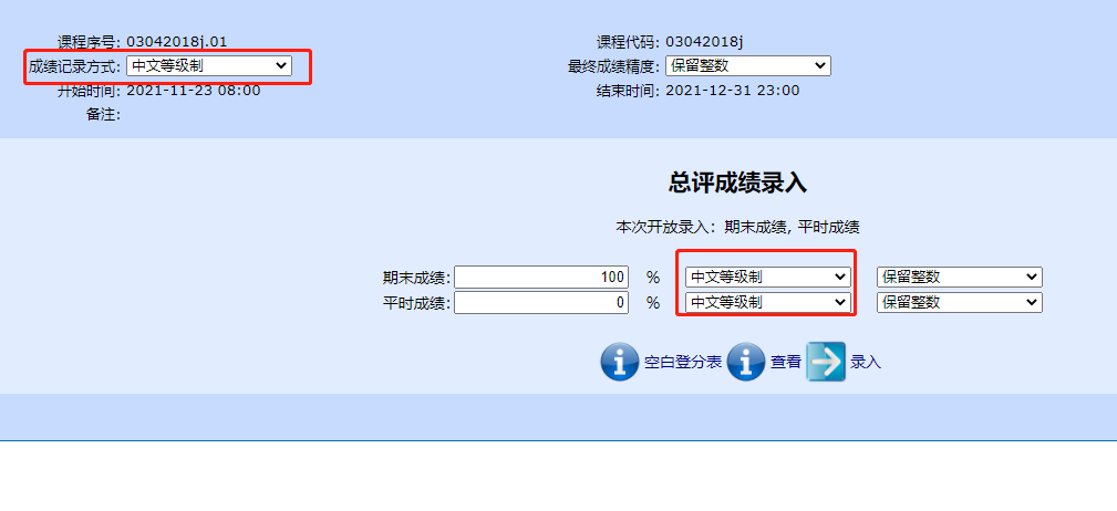 5.注意录入时期末成绩和平时成绩的记录方式和总评成绩的记录方式保持一致,如下图红框标注所示。